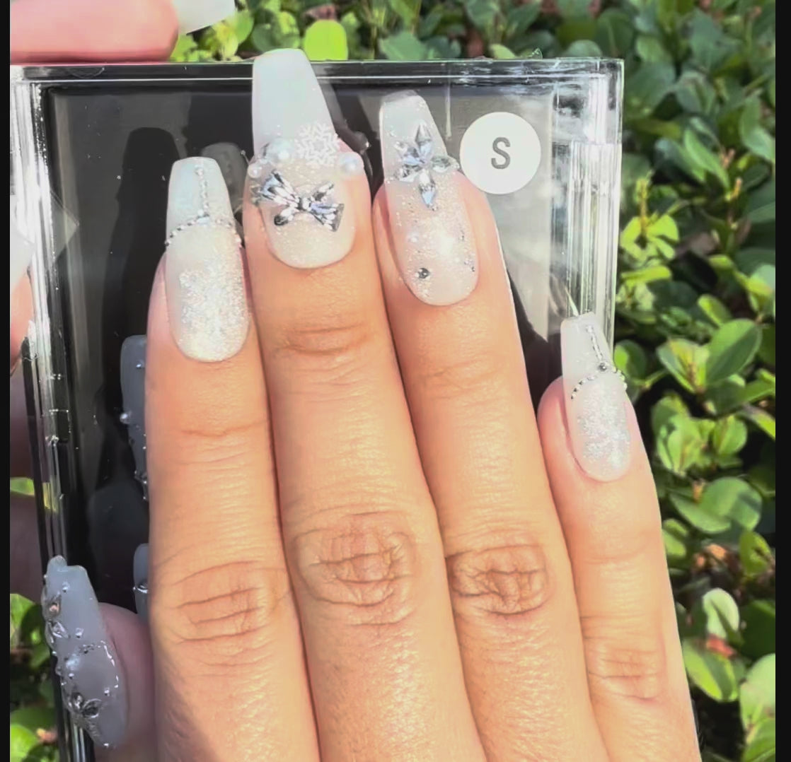 KLAM Studio Nails Snowfall Crystal, Handmade Acrylic Press-On Nails, Coffin Long Length, Silver Snowflakes and Pearls, Reusable, Salon-Quality Finish in Minutes