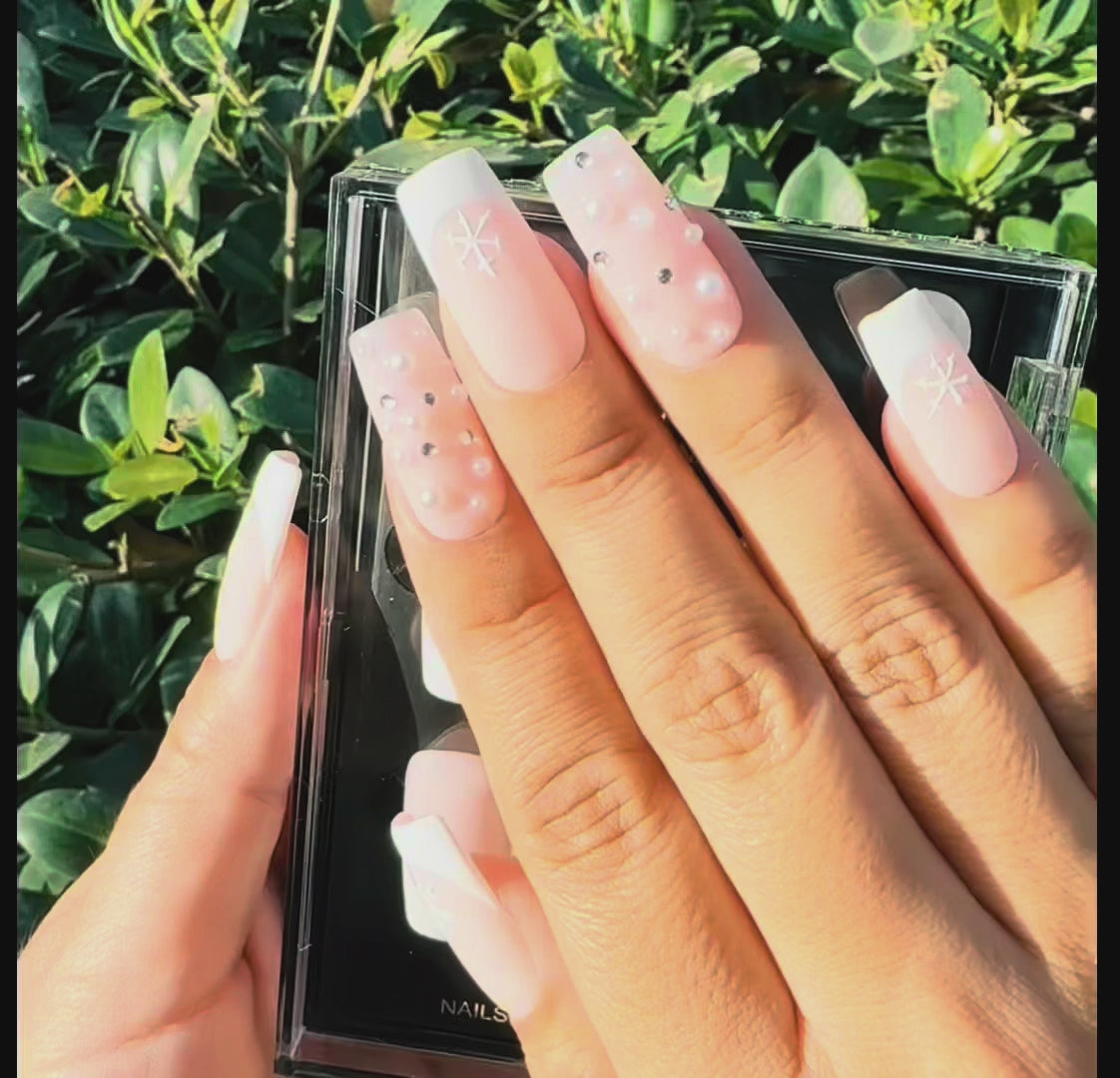 KLAM Studio Nails Frosted Snowflake French Square, Handmade Acrylic Press-On Nails, Long Square Length, Nude French Tips with Rhinestone Starbursts, Reusable, Salon-Quality Finish in Minutes