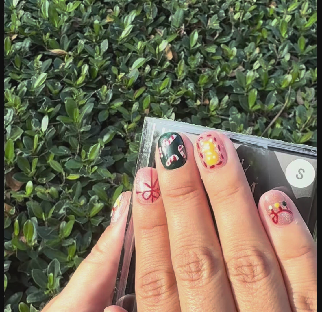 KLAM Studio Nails Merry Icons, Handmade Acrylic Press-On, Round Extra Short Length, Red & Green with Snowman & Holiday Art, Reusable, Salon-Quality Finish in Minutes